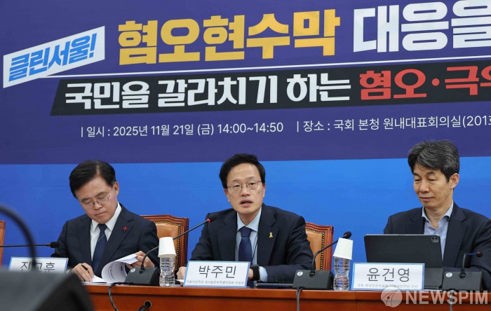 [서울=뉴스핌] 윤창빈 기자 = 박주민 더불어민주당 새서울준비특별위원장이 21일 서울 여의도 국회에서 열린 혐오 현수막 대응을 위한 간담회에서 모두발언을 하고 있다. 2025.11.21 pangbin@newspim.com
