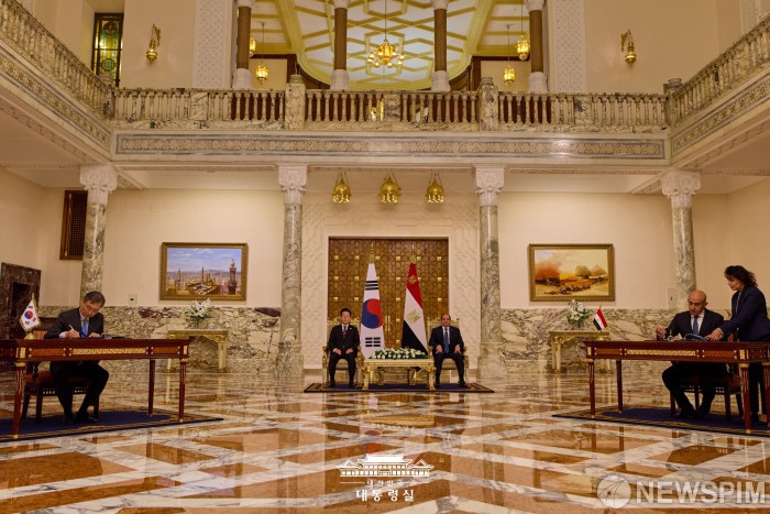 [서울=뉴스핌] 이집트를 공식 방문 중인 이재명 대통령이 지난 20일(현지시간) 카이로 대통령궁에서 압델 파타 알시시 대통령과 한-이집트 정상회담을 마치고 양해각서 서명식에 자리하고 있다. [사진=대통령실] 2025.11.21 photo@newspim.com