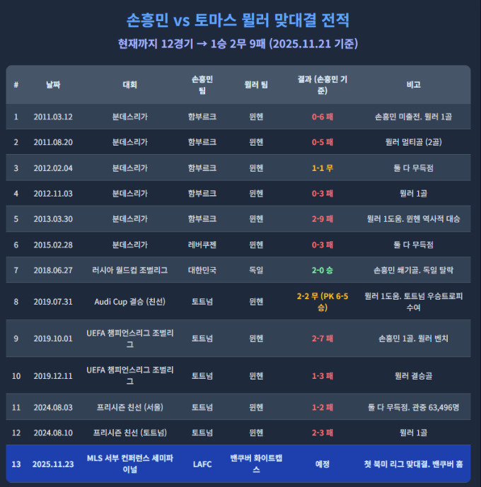 [서울=뉴스핌] 장환수 스포츠전문기자= 손흥민과 토마스 뮐러 맞대결 일지. [그래픽=그록으로 작성] 2025.11.22 zangpabo@newspim.com