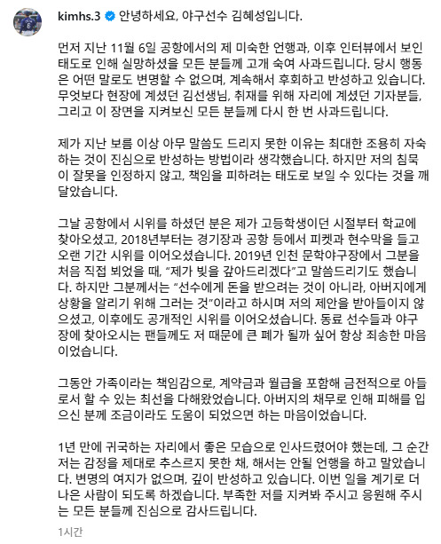 김혜성은 22일 자신의 SNS에 "11월 6일 공항에서의 미숙한 언행과 이후 인터뷰에서 보인 태도로 실망하셨을 모든 분들께 사과드린다"고 글을 올렸다. 그는 시즌을 마치고 인천국제공항을 통해 귀국하면서 부친의 채권자로 알려진 사람이 현수막을 들고 나타나자 인터뷰 도중 삿대질과 함께 "저 분이 가시면 인터뷰하겠다"고 말했다. 이어 그를 향해 "말로 하세요, 말로. 왜 만날 저렇게"라며 분노를 드러냈다.