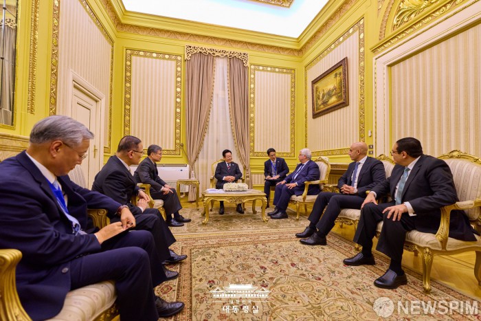 [서울=뉴스핌] 이집트를 공식 방문 중인 이재명 대통령이 지난 20일(현지시간) 카이로대학교에서 무함마드 사미 압델사덱 카이로대학교 총장과 사전환담을 하고 있다. [사진=대통령실] 2025.11.22 photo@newspim.com