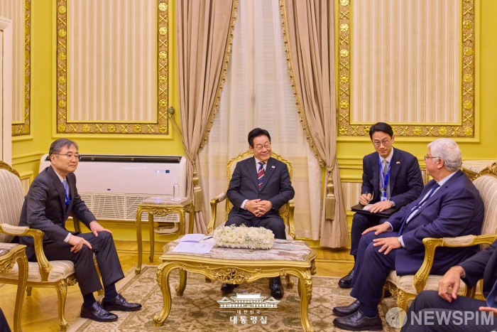 [서울=뉴스핌] 이집트를 공식 방문 중인 이재명 대통령이 지난 20일(현지시간) 카이로대학교에서 무함마드 사미 압델사덱 카이로대학교 총장과 사전환담을 하고 있다. [사진=대통령실] 2025.11.22 photo@newspim.com