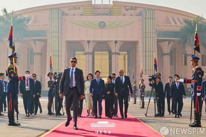 [서울=뉴스핌] 이집트 공식 방문을 마친 이재명 대통령이 지난 21일(현지시간) 남아공 주요 20개국(G20) 정상회의 참석을 위해 카이로 국제공항에서 공군 1호기로 이동하고 있다. [사진=대통령실] 2025.11.22 photo@newspim.com