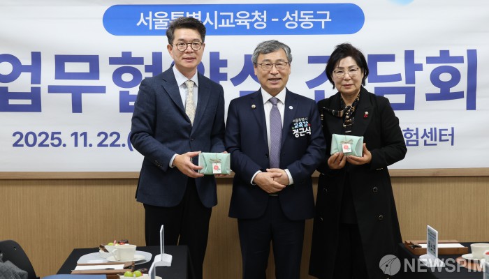 [서울=뉴스핌] 양윤모 기자 = 정근식 서울시교육감과 정원오 성동구청장이 22일 서울 성동구 성동AI미래기술체험센터에서 ‘성동교육협력특화지구’ 업무협약을 체결후 간담회에 앞서 기념촬영을 하고 있다. 이번 협약을 통해 성동광진교육지원청과 성동구는 지역의 교육 환경과 인프라를 기반으로 특색있는 교육프로그램을 공동으로 운영할 예정이다. [사진=서울시교육청] 2025.11.23 yym58@newspim.com