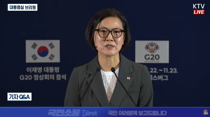 | 오현주 국가안보실 3차장이 23일(현지시간) 요하네스버그 현지에 마련된 프레스센터에서 브리핑을 갖고 이재명 대통령의 주요 20개국(G20) 정상회의 성과를 설명하고 있다. [사진=KTV] |