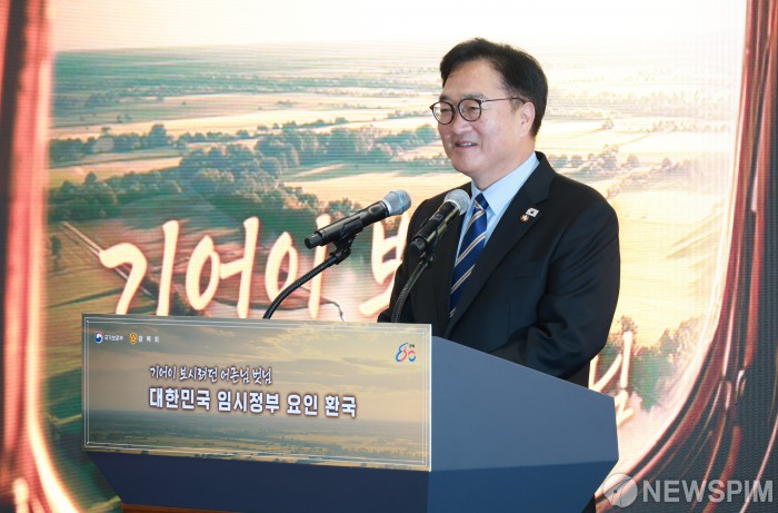 [서울=뉴스핌] 김학선 기자 = 우원식 국회의장이 23일 서울 강서구 김포공항 국제선 청사 입국장에서 열린 '광복80년 대한민국임시정부 요인 환국 재현' 행사에서 환영사를 하고 있다. 2025.11.23 yooksa@newspim.com