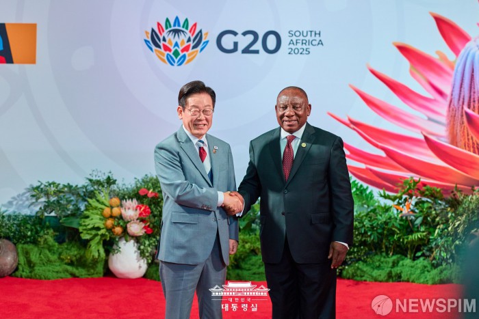 [서울=뉴스핌] 이재명(왼쪽) 대통령이 22일(현지시간) 오전 남아프리카공화국 요하네스버그에서 열리는 주요 20개국(G20) 정상회의장에 도착해 시릴 라마포사 남아공 대통령과 악수 인사하고 있다. [사진=대통령실] 2025.11.23 photo@newspim.com