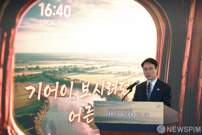 [서울=뉴스핌] 김학선 기자 = 김민석 국무총리가 23일 서울 강서구 김포공항 국제선 청사 입국장에서 열린 '광복80년 대한민국임시정부 요인 환국 재현' 행사에서 환영사를 하고 있다. 2025.11.23 yooksa@newspim.com