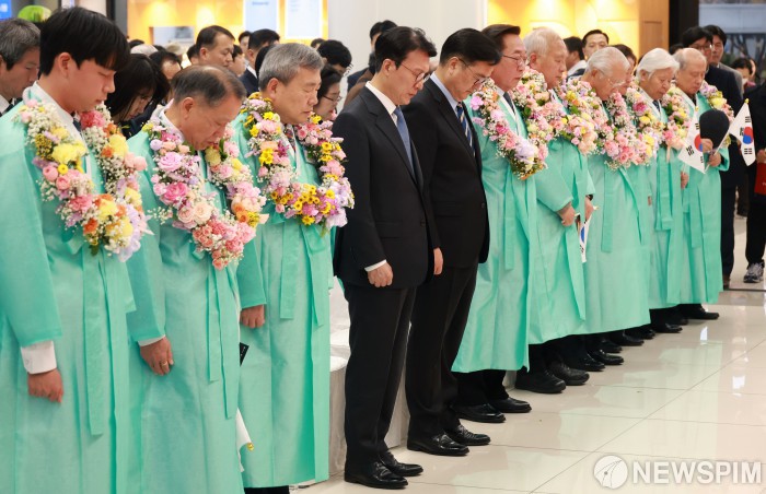 [서울=뉴스핌] 김학선 기자 = 우원식 국회의장과 김민석 국무총리가 23일 서울 강서구 김포공항 국제선 청사 입국장에서 열린 '광복80년 대한민국임시정부 요인 환국 재현' 행사에서 임시정부 요인 후손과 함께 묵념하고 있다. 2025.11.23 yooksa@newspim.com