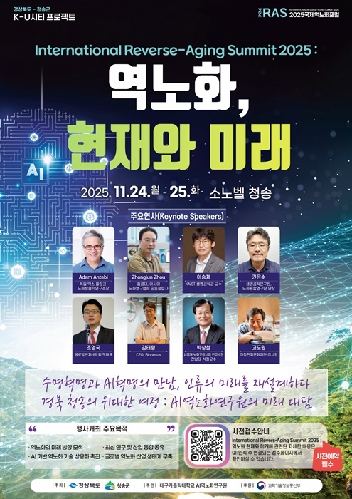 이번 포럼은 청송군이 추진 중인 'K-U시티 역노화' 사업의 핵심 국제 행사이다. 독일, 홍콩 등 세계적 역노화 석학을 비롯해 국내 연구진과 역노화, AI, 바이오 분야 주요 기업이 대거 참여해 역노화 기술의 현재와 미래를 공유한다.