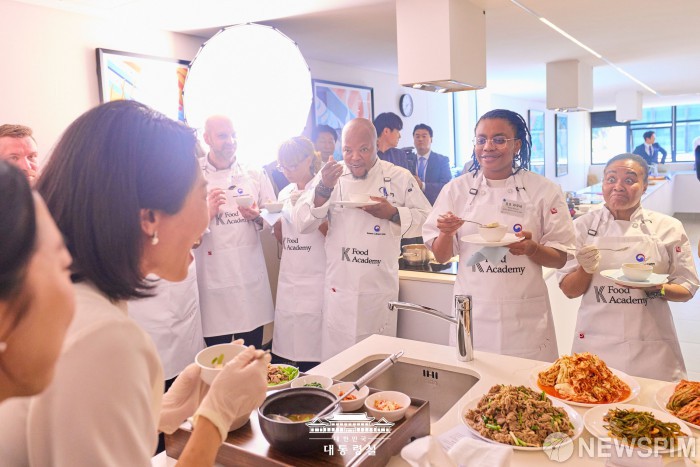 [서울=뉴스핌] 이재명 대통령과 함께 남아프리카공화국을 방문 중인 김혜경 여사가 지난 22일(현지시간) 요하네스버그 주남아공한국문화원에서 열린 한국 장문화 한식행사에서 학생들과 음식을 맛보고 있다. [사진=대통령실] 2025.11.24 photo@newspim.com