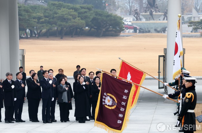 [서울=뉴스핌] 최지환 기자 = 신임 대표로 선출된 조국 조국혁신당 대표가 24일 오전 서울 동작구 국립서울현충원을 찾아 국기에 경례하고 있다. 2025.11.24 choipix16@newspim.com