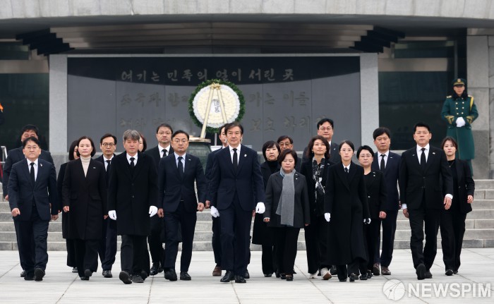 [서울=뉴스핌] 최지환 기자 = 신임 대표로 선출된 조국 조국혁신당 대표가 24일 오전 서울 동작구 국립서울현충원을 찾아 참배를 마친 뒤 이동하고 있다. 2025.11.24 choipix16@newspim.com