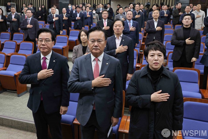 [서울=뉴스핌] 윤창빈 기자 = 송언석 국민의힘 원내대표 등 소속 의원들이 24일 서울 여의도 국회에서 열린 의원총회에서 국민의례를 하고 있다. 2025.11.24 pangbin@newspim.com