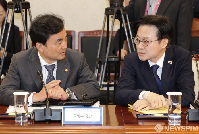 [서울=뉴스핌]이길동 기자 =24일 오전 정부서울청사에서 열린 과학기술관계장관회의에앞서 안규백 국방부장관(왼쪽)과 김정관 산업통상부 장관이 대화를 하고 있다. 2025.11.24 gdlee@newspim.com