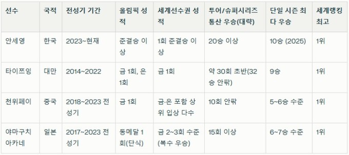 안세영, 타이쯔잉, 천위페이, 야마구치 경력과 성적 비교. [사진=AI 클로드로 작성]