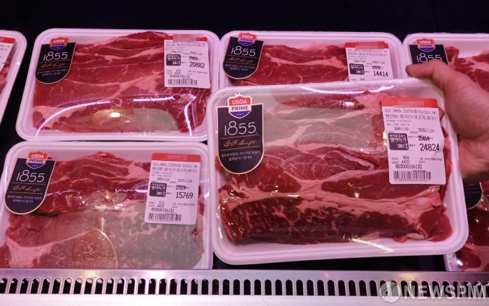 [서울=뉴스핌] 양윤모 기자 = 한우 대신 '가성비 소고기'로 즐겨 찾는 미국산 소고기 가격이 상승세를 보이고 있는 가운데, 24일 서울 시내 한 대형마트에서 미국산 소고기를 구입하고 있다. 21일 축산물품질평가원 축산유통 정보에 따르면 지난달 미국산 냉동 갈비 소비자 가격은 100g당 4435원으로 전년 4304원 대비 3%, 평년 3718원 대비 19.3% 높아졌으며 대형마트 기준으로는 1년 새 가격이 20%가량 상승했다. 이 같은 가격 상승의 가장 큰 배경으로는 미국 현지에서 소 사육 규모가 급감으로 전해졌다. 2025.11.24 yym58@newspim.com