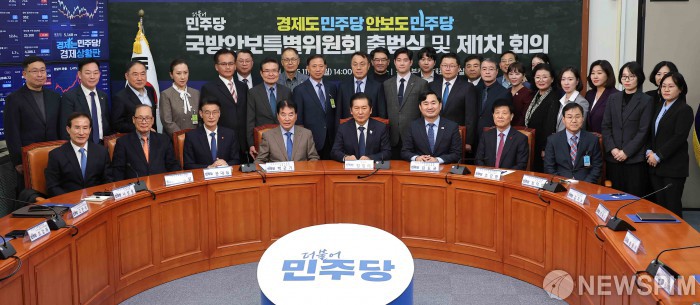 [서울=뉴스핌] 윤창빈 기자 = 정청래 더불어민주당 대표 등 참석자들이 24일 서울 여의도 국회에서 열린 국방안보특별위원회 출범식 및 제1차 회의에서 기념촬영을 하고 있다. 2025.11.24 pangbin@newspim.com