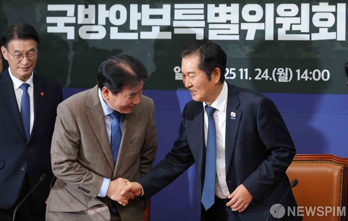 [서울=뉴스핌] 윤창빈 기자 = 정청래 더불어민주당 대표가 24일 서울 여의도 국회에서 열린 국방안보특별위원회 출범식 및 제1차 회의에서 백군기 공동위원장과 악수하고 있다. 2025.11.24 pangbin@newspim.com