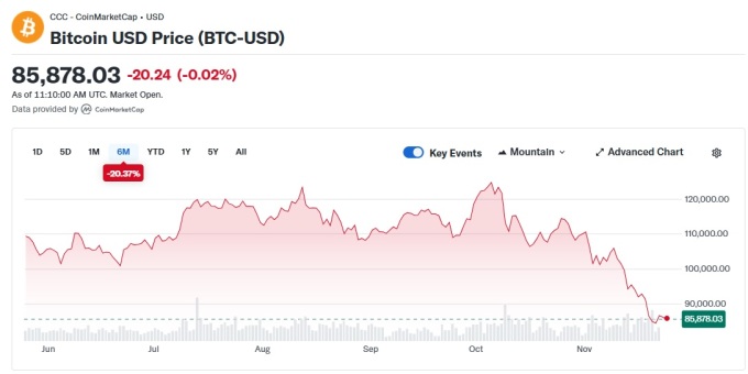 | 비트코인 가격 차트, 자료=야후파이낸스, 2025.11.24 koinwon@newspim.com |