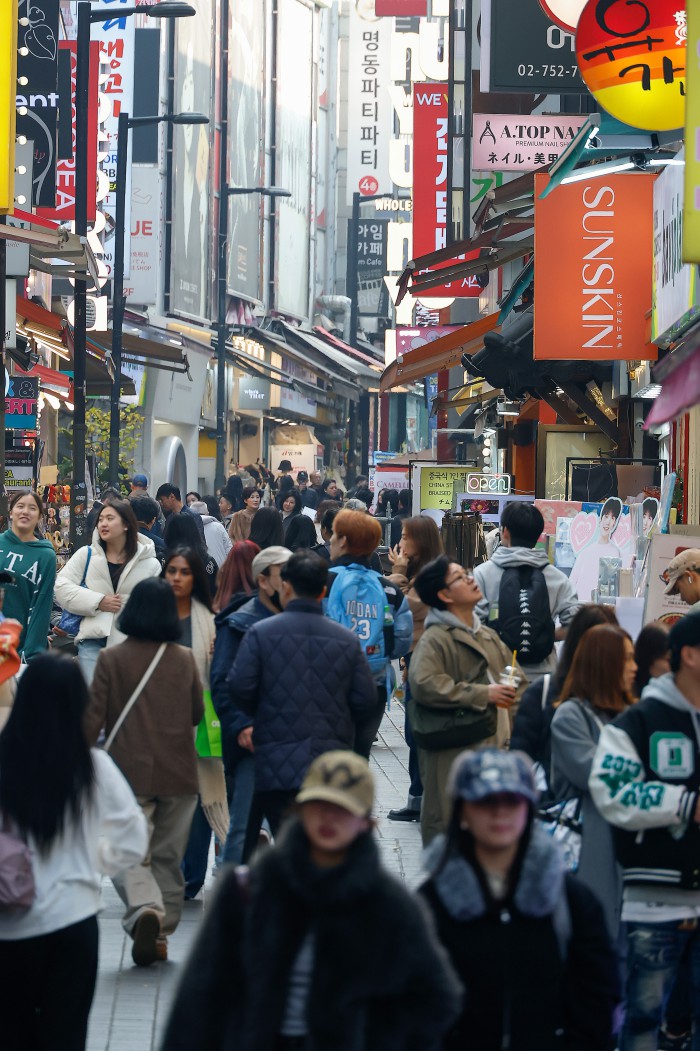 [서울=뉴스핌] 류기찬 기자 = 중국과 일본의 갈등으로 중국 정부가 자국민에게 일본 여행과 유학 등 방문 자제령을 내리면서 한국이 대체 여행지로 각광 받고 있다. 24일 오후 서울 중구 명동거리가 관광객들로 붐비고 있다. 2025.11.24 ryuchan0925@newspim.com
