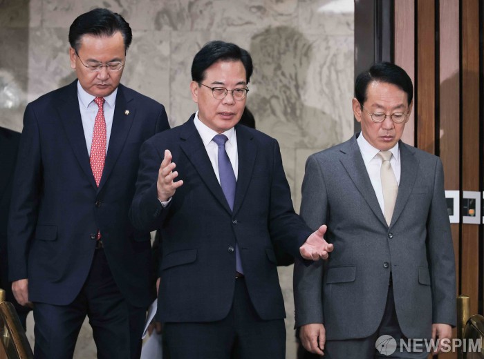 [서울=뉴스핌] 윤창빈 기자 = 송언석 국민의힘 원내대표가 25일 서울 여의도 국회에서 열린 원내대책회의에 참석하고 있다. 왼쪽부터 유상범 원내운영수석부대표, 송 원내대표, 김도읍 정책위의장. 2025.11.25 pangbin@newspim.com