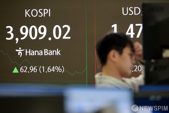[서울=뉴스핌] 김학선 기자 = 코스피가 장중 3900선을 회복한 25일 오전 서울 중구 하나은행 딜링룸 전광판에 코스피 지수가 표시돼 있다. 2025.011.25 yooksa@newspim.com
