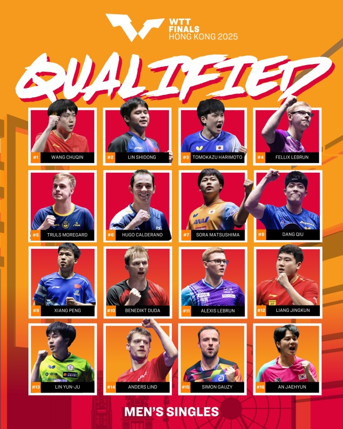 [서울=뉴스핌] 장환수 스포츠전문기자= WTT 홍콩 파이널스 남자단식 출전자 16명. [사진=WTT] 2025.11.25 zangpabo@newspim.com