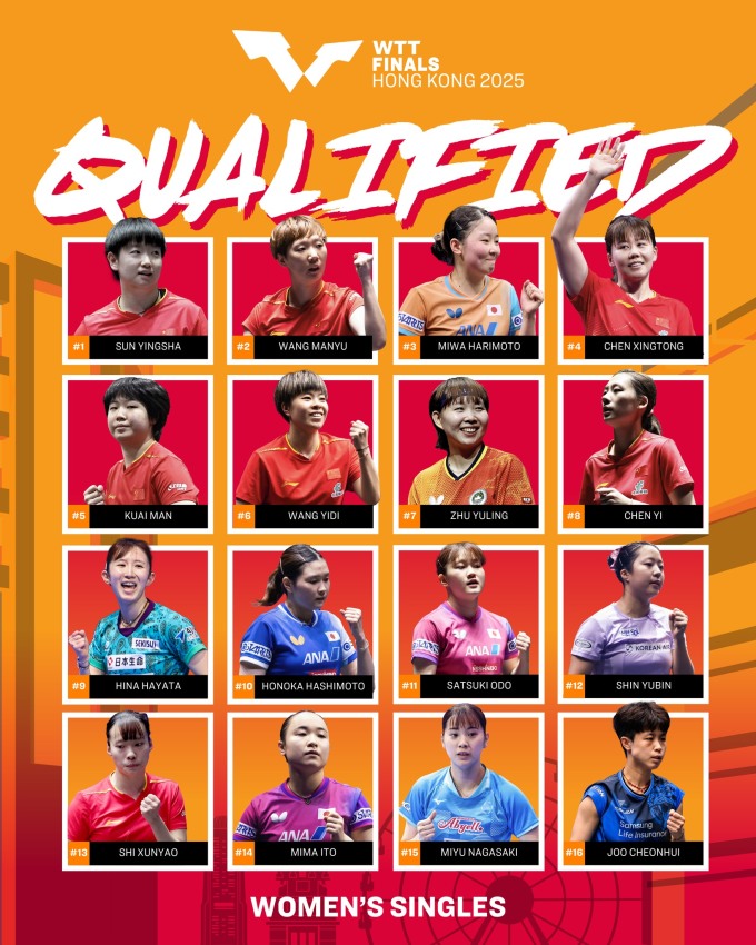 [서울=뉴스핌] 장환수 스포츠전문기자= WTT 홍콩 파이널스 여자단식 출전자 16명. [사진=WTT] 2025.11.25 zangpabo@newspim.com