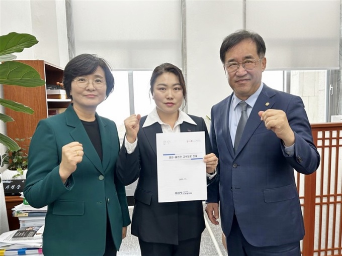 | 김기현 더불어민주당경산위원장(가운데)이 24일 맹성규 국회 국토교통위원장(오른쪽)과 임미애 국회의원을 만나 이재명 대통령의 공약인 '경산~울산 간 고속도로'의 국토부 '제3차 고속도로 건설종합계획안' 반영을 촉구한 후 기념 촬영하고 있다.[사진=민주당경산지역위]2025.11.25 nulcheon@newspim.com |