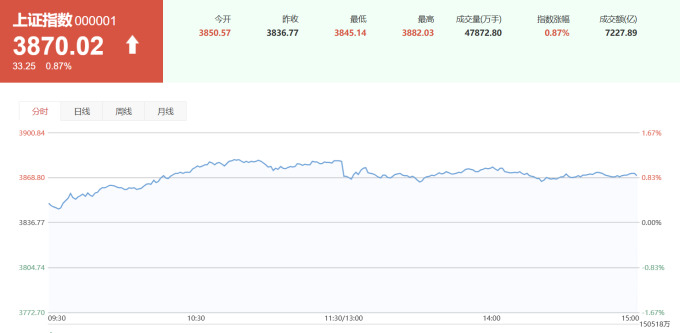 상하이종합지수 3870.02(+33.25, +0.87%)