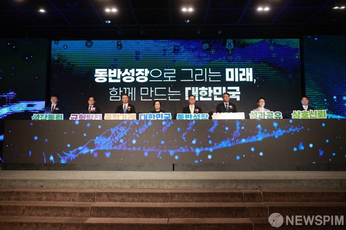 [서울=뉴스핌] 한성숙 중소벤처기업부 장관(왼쪽에서 네 번째)이 25일 서울 영등포구 중소기업중앙회에서 열린 '2025 동반성장 주간 기념식'에서 이달곤 동반성장위원장(왼쪽에서 다섯 번째)을 비롯한 참석자들과 퍼포먼스를 하고 있다. [사진=중소벤처기업부] 2025.11.25 photo@newspim.com