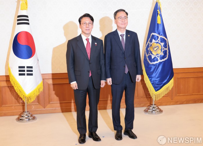 [서울=뉴스핌] 이길동 기자 = 김민석 국무총리가 25일 서울 종로구 정부서울청사에서 열린 차관급 임명장 수여식에서 김영수 문화체육관광부 제1차관에게 임명장 수여 후 기념촬영을 하고있다. 2025.11.25 gdlee@newspim.com