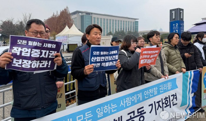 [서울=뉴스핌] 양윤모 기자 = 노동자 건강권 단체들이 25일 서울 여의도 국회 앞에서 기자회견을 열고 “모든 일하는 사람에게 작업중지권을 실질적으로 보장하라”며 산업안전보건법 개정을 촉구했다. 이들은 “산재사망을 줄이겠다던 정부의 종합대책이 노동자의 현장 참여와 권리 보장을 담보하지 못하고 있다”고 주장했다. [사진=민주노총] 2025.11.25 yym58@newspim.com