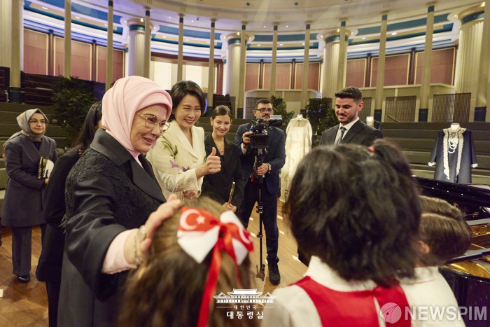 [서울=뉴스핌] 김혜경 여사가 지난 24일(현지시간) 튀르키예 대통령 부인 에미네 에르도안 여사와 앙카라의 국민 도서관에서 아이들과 인사를 나누고 있다. [사진=대통령실] 2025.11.26 photo@newspim.com