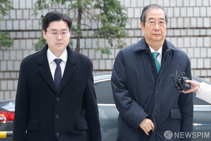[서울=뉴스핌] 류기찬 기자 = 한덕수 전 국무총리가 26일 오전 서울 서초구 서울중앙지법에서 열린 내란 방조 및 내란 중요임무 종사 혐의 관련 결심공판에 출석하고 있다. 2025.11.26 ryuchan0925@newspim.com