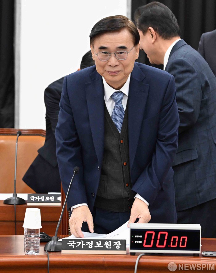 [서울=뉴스핌] 윤창빈 기자 = 이종석 국가정보원장이 26일 서울 여의도 국회에서 열린 정보위원회 전체회의에 출석하고 있다. 2025.11.26 pangbin@newspim.com