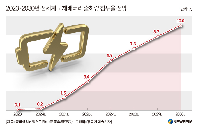 중국 중국상업산업연구원(中商產業研究院)에 따르면 전세계 고체 배터리의 침투율(전체 배터리에서 고체 배터리가 차지하는 비중)은 2027년 5.9%에서 2030년 10%로 늘어날 전망이다.