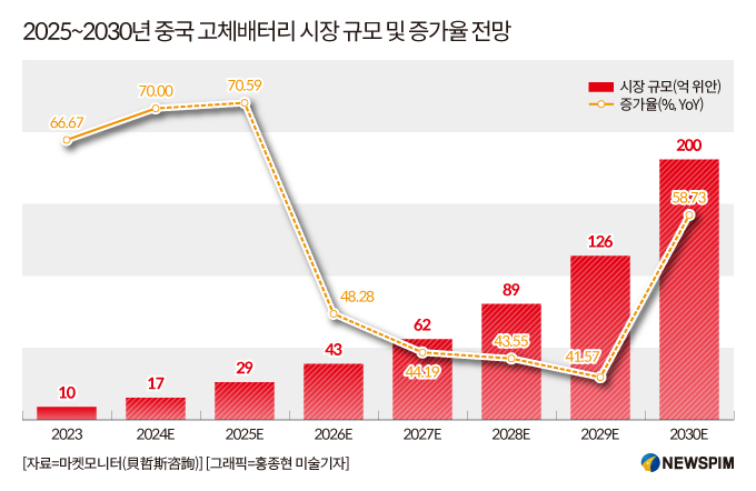 중국 시장조사업체 마켓모니터(貝哲斯咨詢)에 따르면 중국 전고체 배터리 시장 규모는 2030년 200억 위안으로 전년 동기 대비 58.73%의 성장률을 보일 것으로 예상된다. 또 2030년 중국 전고체 배터리 출하량은 251.1 기가와트시(GWh)에 달할 것으로 추산된다.