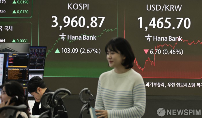 [서울=뉴스핌] 양윤모 기자 = 26일 오후 코스피가 전장 종가보다 103.09 포인트(2.67%) 상승하며 3960.87로, 코스닥은 21.29 포인트(2.49%) 상승한 877.32로 장을 마감한 가운데, 서울 중구 하나은행 딜링룸에서 직원들이 업무를 보고 있다. 서울외환시장에서 달러/원 환율은 전장 대비 6.70원 하락한 1465.70원에 주간거래를 마감했다. 2025.11.26 yym58@newspim.com