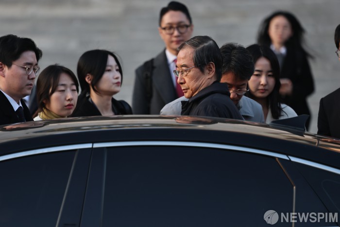 [서울=뉴스핌] 류기찬 기자 = 한덕수 전 국무총리가 26일 오후 서울 서초구 서울중앙지법에서 열린 내란 방조 및 내란 중요임무 종사 혐의 관련 결심공판을 마친 뒤 법원을 나서고 있다. 2025.11.26 ryuchan0925@newspim.com