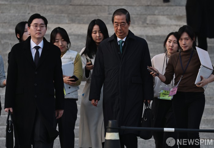 [서울=뉴스핌] 류기찬 기자 = 한덕수 전 국무총리가 26일 오후 서울 서초구 서울중앙지법에서 열린 내란 방조 및 내란 중요임무 종사 혐의 관련 결심공판을 마친 뒤 법원을 나서고 있다. 2025.11.26 ryuchan0925@newspim.com