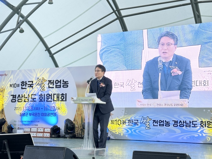 | 손영식 한국농어촌공사 경남지역본부장이 지난 26일 창녕군 부곡온천야외공연장에서 열린 제10회 한국쌀전업농 경남도 회원대회에서 축사하고 있다. [사진=한국농어촌공사 경남지역본부] 2025.11.27 |