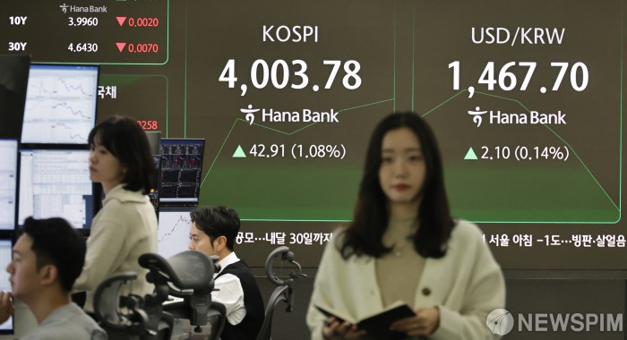 [서울=뉴스핌] 양윤모 기자 = 뉴욕증시가 AI 기대감으로 3대 지수가 동반 상승 마감한 가운데, 27일 오전 코스피가 전장 종가보다 42.91 포인트(1.08%) 상승하며 4003.78로, 코스닥은 4.64 포인트(0.53%) 상승한 881.96으로 장을 시작한 가운데, 서울 중구 하나은행 딜링룸에서 직원들이 업무를 보고 있다. 서울외환시장에서 달러/원 환율은 전장 대비 2.10원 상승한 1467.70원에 주간거래를 시작했다. 2025.11.27 yym58@newspim.com