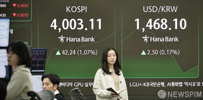[서울=뉴스핌] 양윤모 기자 = 뉴욕증시가 AI 기대감으로 3대 지수가 동반 상승 마감한 가운데, 27일 오전 코스피가 전장 종가보다 42.24 포인트(1.07%) 상승하며 4003.11로, 코스닥은 4.64 포인트(0.53%) 상승한 881.96으로 장을 시작한 가운데, 서울 중구 하나은행 딜링룸에서 직원들이 업무를 보고 있다. 서울외환시장에서 달러/원 환율은 전장 대비 2.50원 상승한 1468.10원에 주간거래를 시작했다. 2025.11.27 yym58@newspim.com