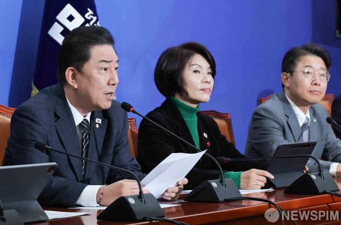 [서울=뉴스핌] 윤창빈 기자 = 김병기 더불어민주당 원내대표가 27일 서울 여의도 국회에서 열린 정책조정회의에서 모두발언을 하고 있다. 2025.11.27 pangbin@newspim.com