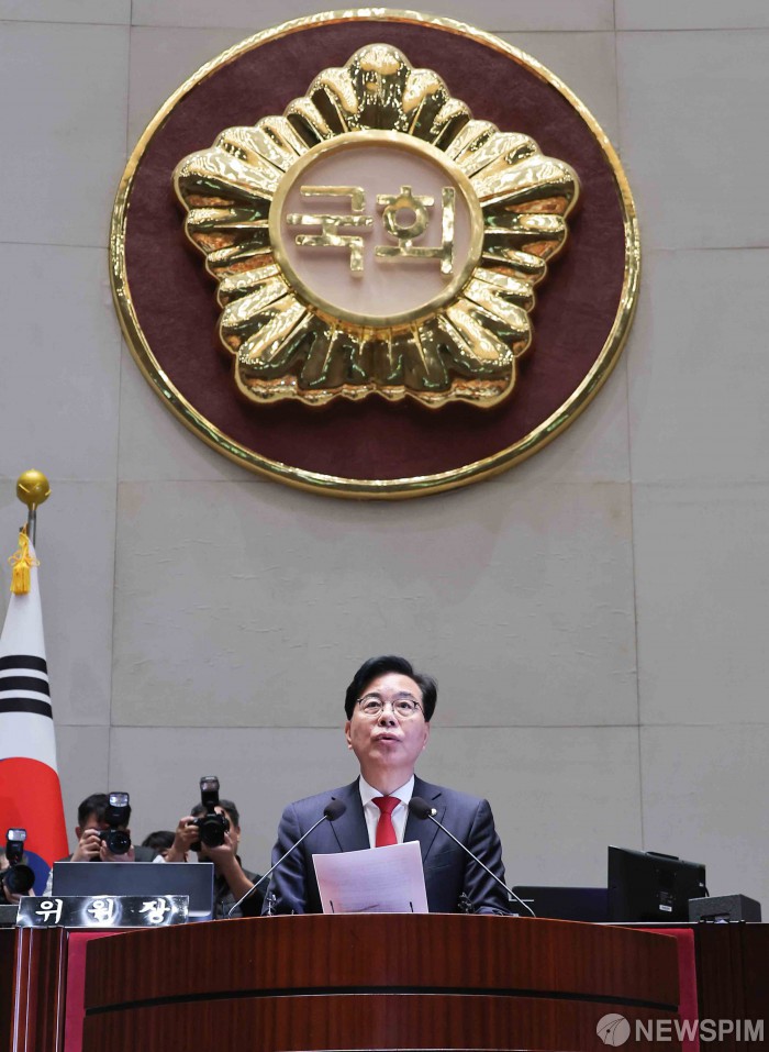 [서울=뉴스핌] 윤창빈 기자 = 송언석 국민의힘 원내대표가 27일 서울 여의도 국회에서 열린 의원총회에서 모두발언을 하고 있다. 2025.11.27 pangbin@newspim.com
