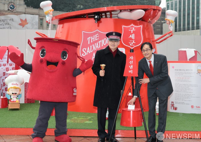 [서울=뉴스핌] 이길동 기자 = 이경우 휘슬러코리아 대표가 27일 오전 서울 중구 서울광장에서 열린 2025 휘슬러 X 구세군 '사랑의 레시피 팟' 자선냄비 전달식에서 자선냄비에 성금을 넣으며 기념촬영을 하고 있다. 왼쪽은 김병윤 한국 구세군 사령관. 2025.11.27 gdlee@newspim.com