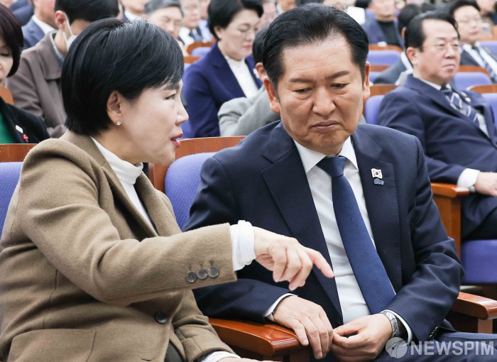 [서울=뉴스핌] 윤창빈 기자 = 정청래 더불어민주당 대표, 전현희 최고위원이 27일 서울 여의도 국회에서 열린 의원총회에서 대화를 하고 있다. 2025.11.27 pangbin@newspim.com
