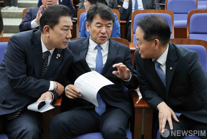 [서울=뉴스핌] 윤창빈 기자 = 김병기 더불어민주당 원내대표, 문진석 원내운영수석부대표, 허영 원내정책수석부대표가 27일 서울 여의도 국회에서 열린 의원총회에서 대화를 하고 있다. 2025.11.27 pangbin@newspim.com